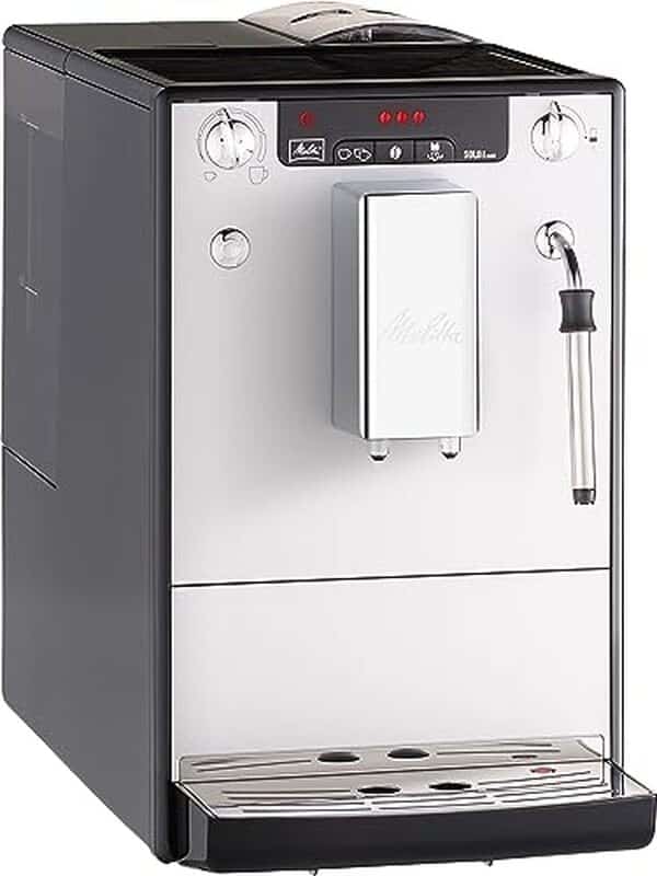 Melitta Solo & Perfect Milk Argent, Machine à Café à Grains avec Broyeur et Système d'Extraction des Arômes, Mode 1 à 2 Tasses, Auto Cappuccinatore, Affichage LED, E957-203, 1400WCompacte (20 cm de largeur), elle permet de préparer jusqu'à 2 tasses simultanément grâce à son bec verseur réglable en hauteur Le système Auto Cappuccinatore permet de préparer facilement de la mousse de lait, du lait chaud ou de l'eau chaude La fonction de pré-infusion humidifie le café fraîchement moulu afin de développer toute la richesse de ses arômes; vous pouvez régler le niveau d'intensité du café ainsi que la finesse de mouture sur 3 niveaux Un témoin lumineux vous indique lorsqu'il est temps de détartrer votre machine à café Solo & Perfect Milk pour prolonger sa durée de vie et préserver les saveurs du café; les programmes de nettoyage et de détartrage sont accessibles via le menu La machine utilise la technologie de la cartouche filtrante Pro Aqua qui permet de réaliser un seul détartrage par an sous réserve de la changer 6 fois par an; l‘eau filtrée améliore la qualité de votre café et évite la formation de dépôts de tartre Contenu : 1x Melitta Solo & Perfect Milk, 1 x Cappuccinatore, 1 x Tuyau à lait Dimensions : 200 x 325 x 455 mm; Poids : 8,1 kg Retrouvez un guide interactif avec des conseils, des astuces, des tutoriels illustrés et d'autres fonctions pratiques pour utiliser et entretenir votre machine expresso automatique en téléchargeant l'application Melitta Companion La machine est réparable et dispose de nombreuses pièces de rechange; les pièces détachées sont disponibles 10 ans